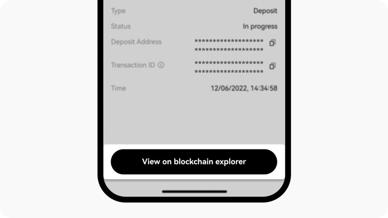 입금과 관련된 세부 사항을 확인하려면, 해당하는 입금 트랜잭션을 클릭하세요. 입금 코인, 금액, 상태, 시간 등이 표시됩니다. 이를 블록체인 탐색기에서 자세하게 보려면 'View on blockchain explorer'을 누르세요.