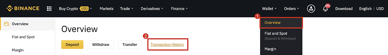 그렇다면 실제로 확인해볼까요? 바이낸스에서 TxID를 확인하는 방법은 다음과 같습니다. 먼저, 바이낸스 가입 및 KYC 인증을 완료한 계정에 로그인해주세요. 다음으로 [Wallet] - [Overview]를 클릭하세요.