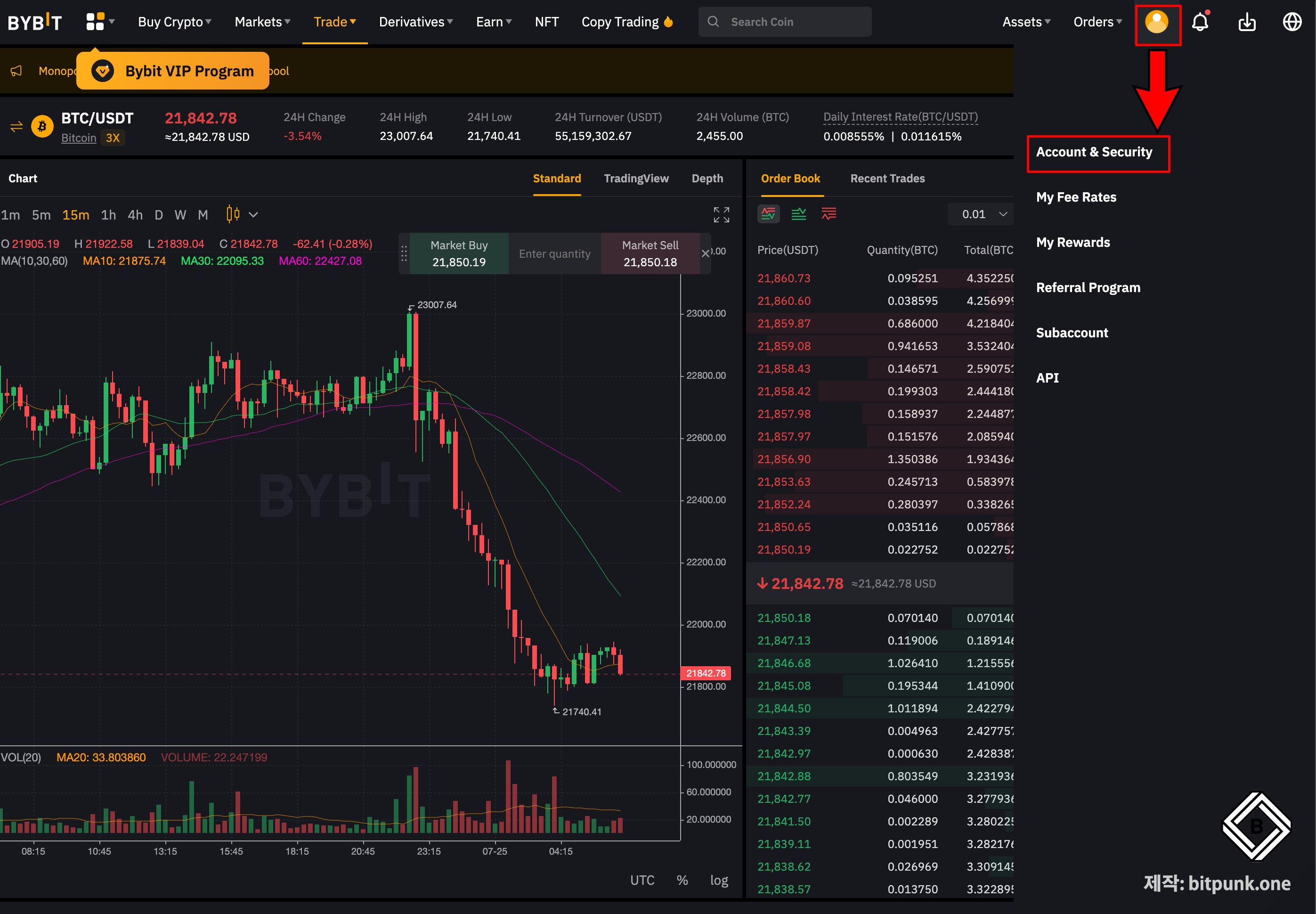 바이비트 웹에서 2단계 보안 설정하는 방법은 다음과 같습니다. 계정에 로그인한 다음 우측 상단의 계정 및 보안(Account & Security)으로 이동합니다.