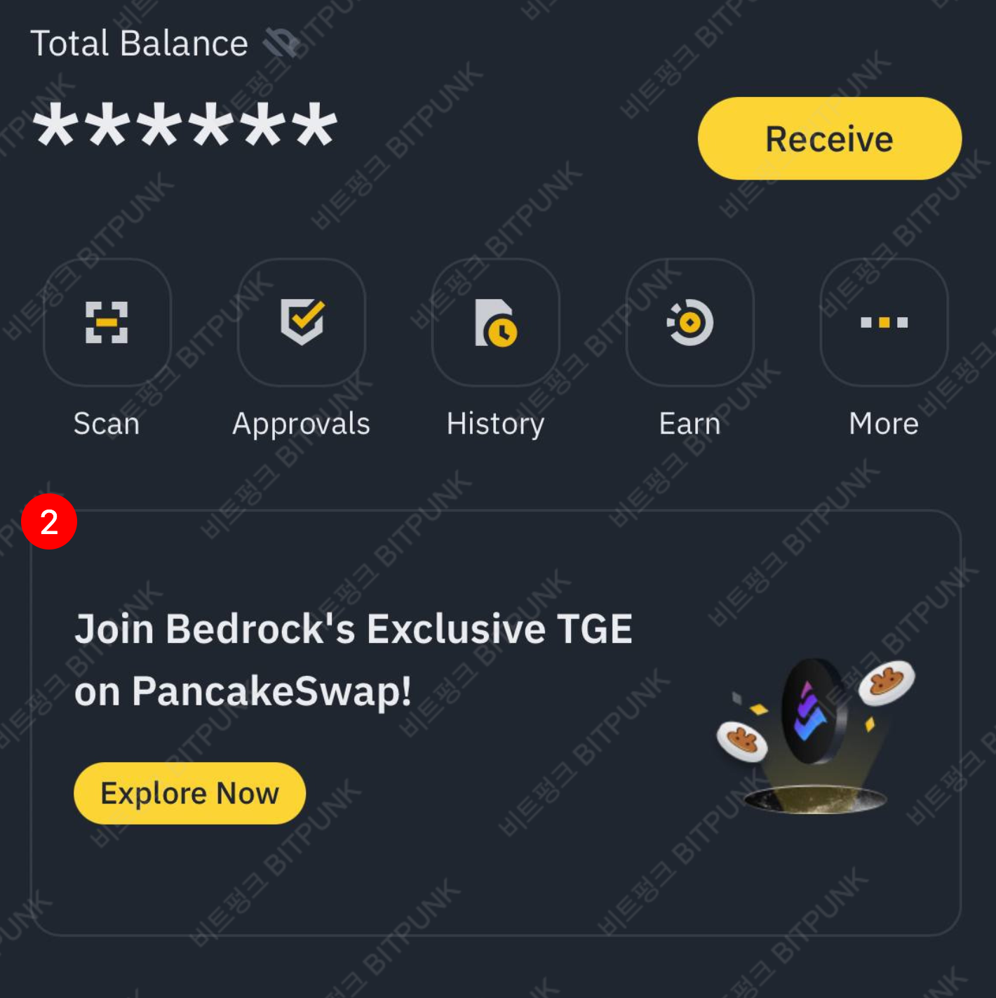 [Wallet]으로 들어오시면 홈 화면에 아래와 같이 'TGE' 또는 'IDO' 배너가 표시됩니다. 해당 배너에 보이는 'Explore Now' 노란색 버튼을 누르시면 IDO 토큰 세일 페이지로 이동하실 수 있습니다.