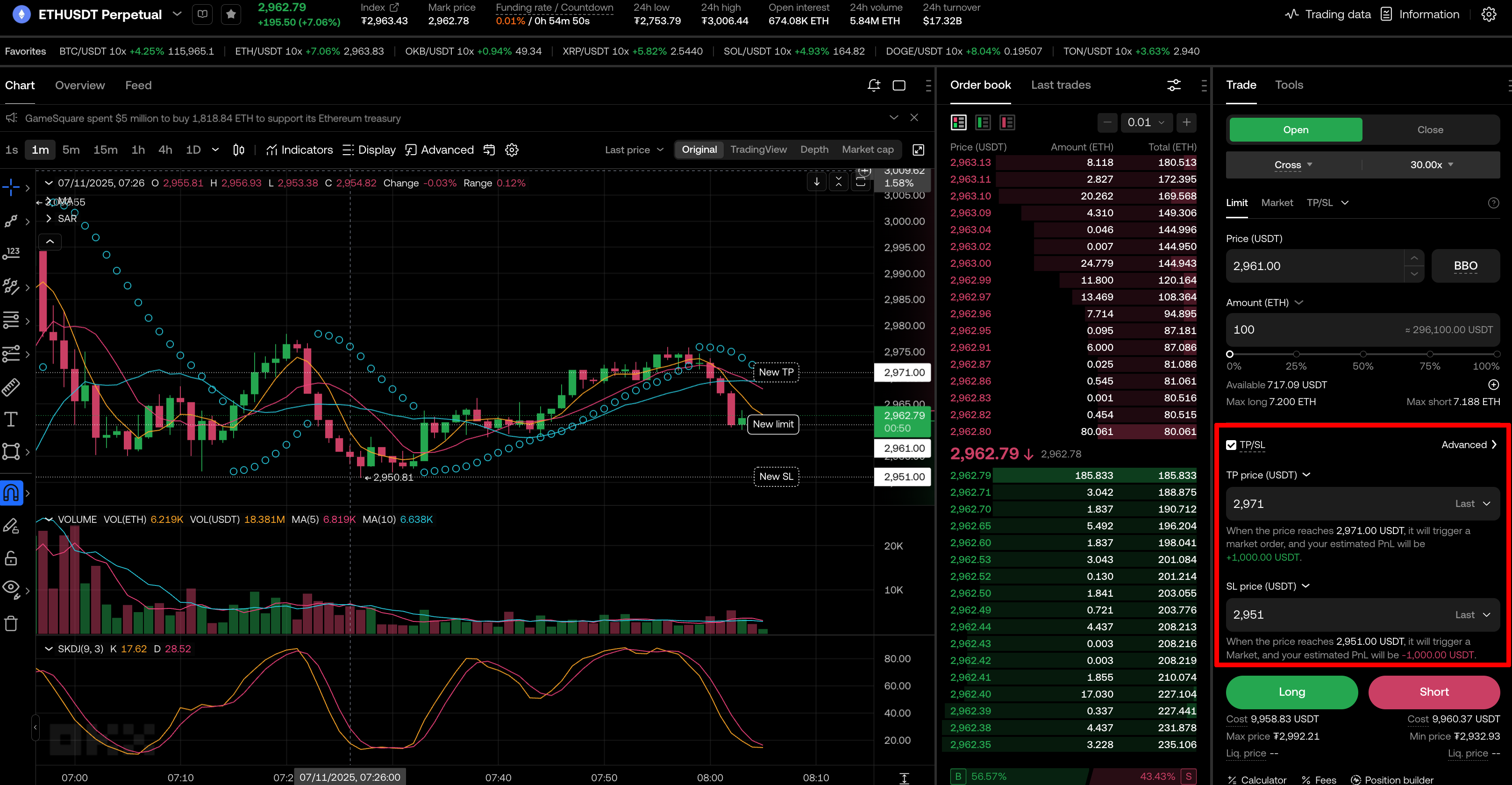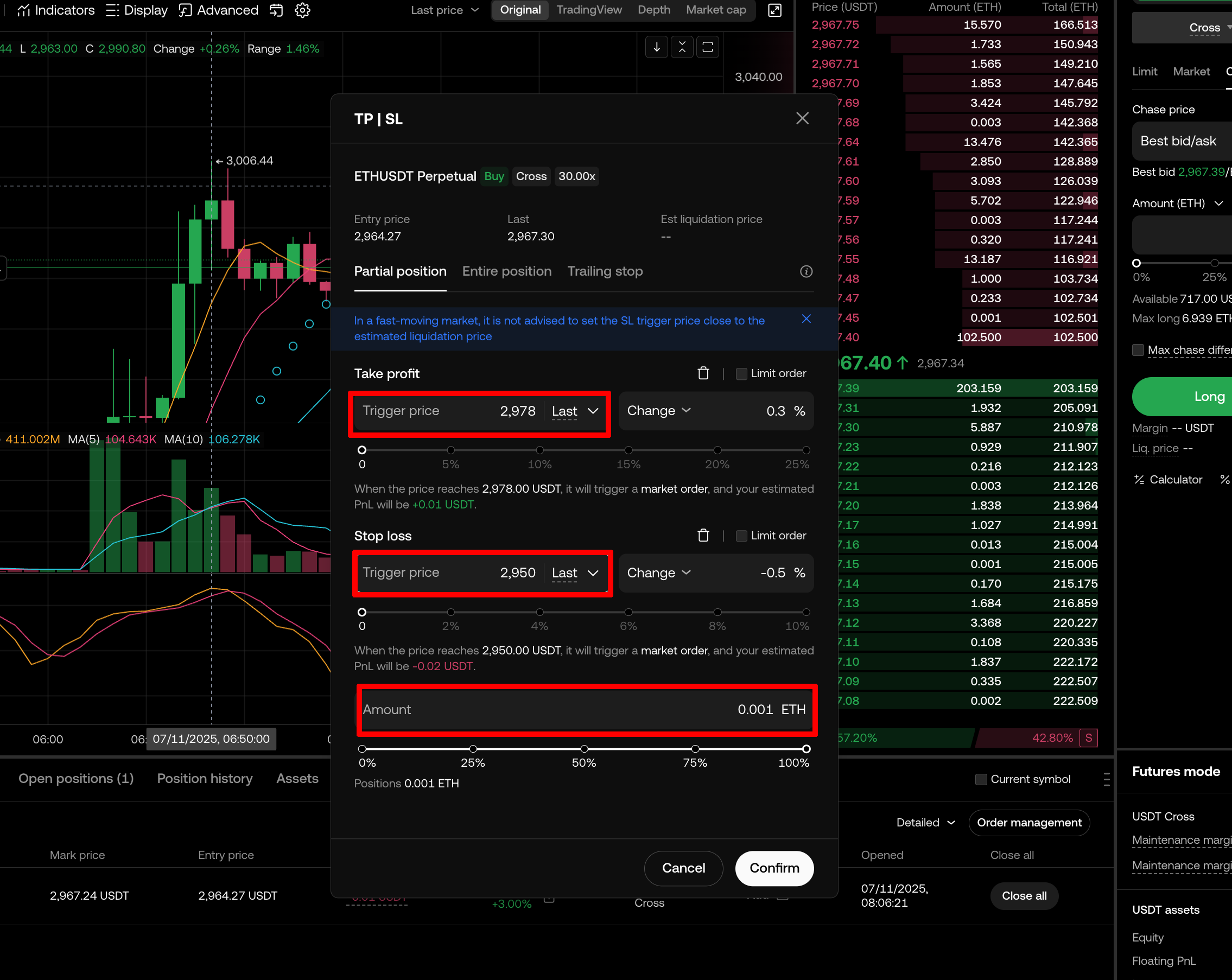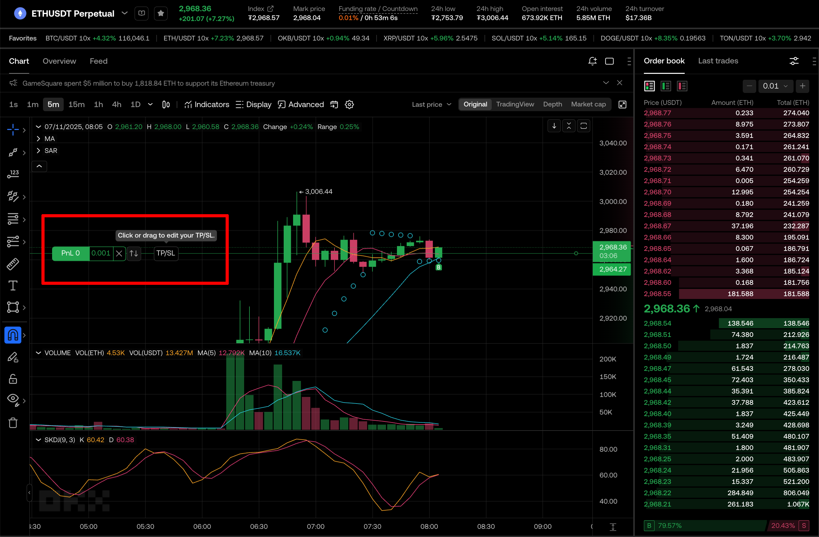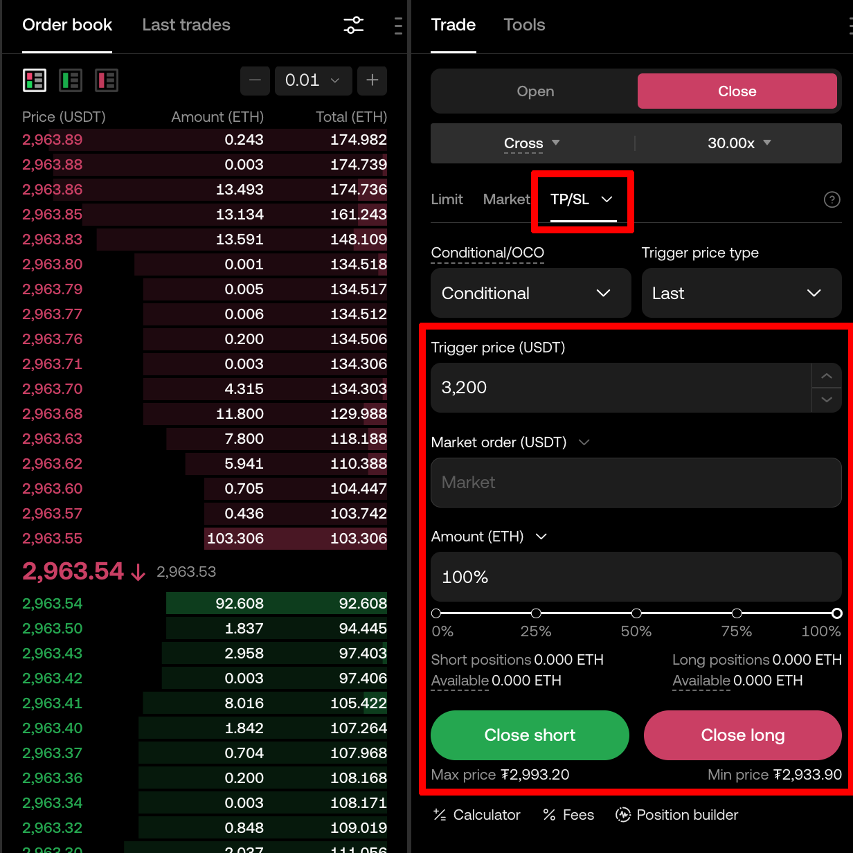 또는 이미 거래가 진행 중이라면, 주문창에서 'TP/SL' 옵션을 눌러 스탑 로스 및 이익 실현 주문을 설정할 수 있습니다.