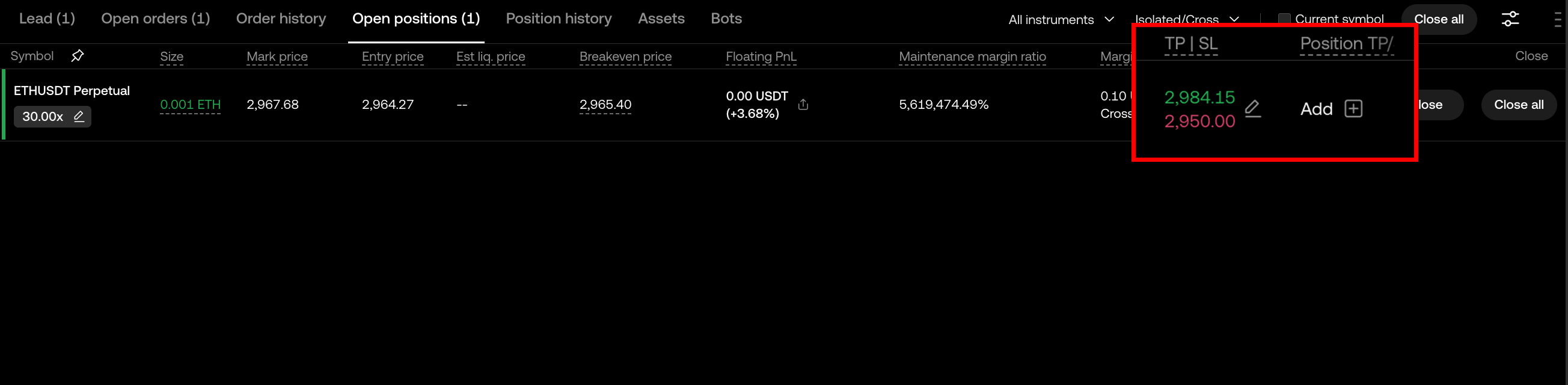 만약, 선물 거래에서 포지션을 보유하고 있다면 하단의 'Open Position' 섹션에서 스탑 로스 및 이익 실현을 설정할 수도 있습니다.