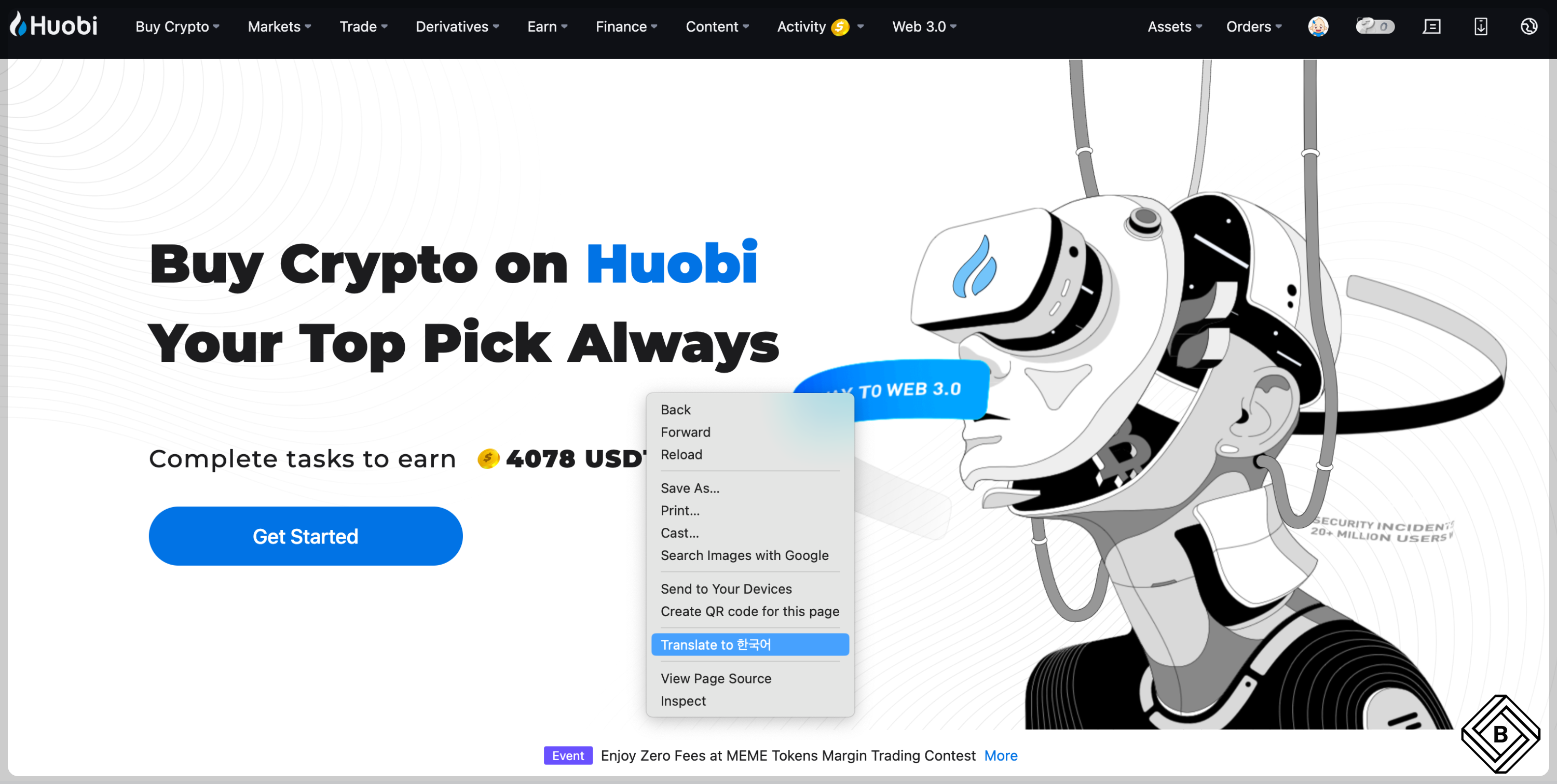 후오비 가입이 완료되었습니다! 이제 거래소에서 자유롭게 거래하실 수 있습니다. 후오비 거래소를 한국어로 이용하고 싶으시다면 마우스 우클릭을 한 다음 [한국어 번역] 탭을 선택하세요.