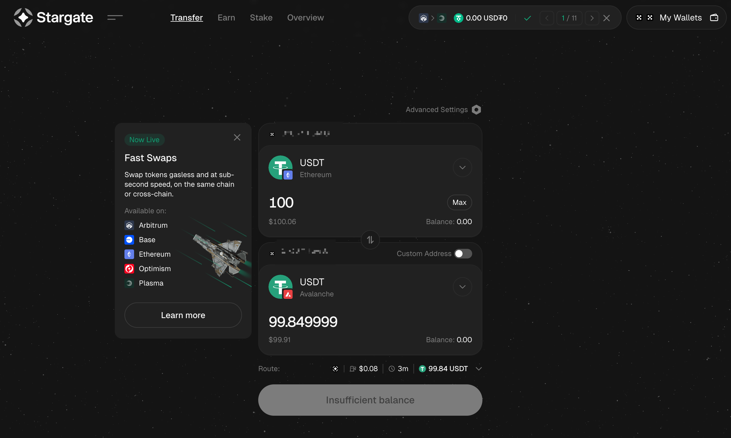 전송할 금액을 입력한 다음, 예상 수수료와 슬리피지를 확인합니다. ‘Transfer’ 버튼 클릭 후 지갑에서 트랜잭션 승인합니다.