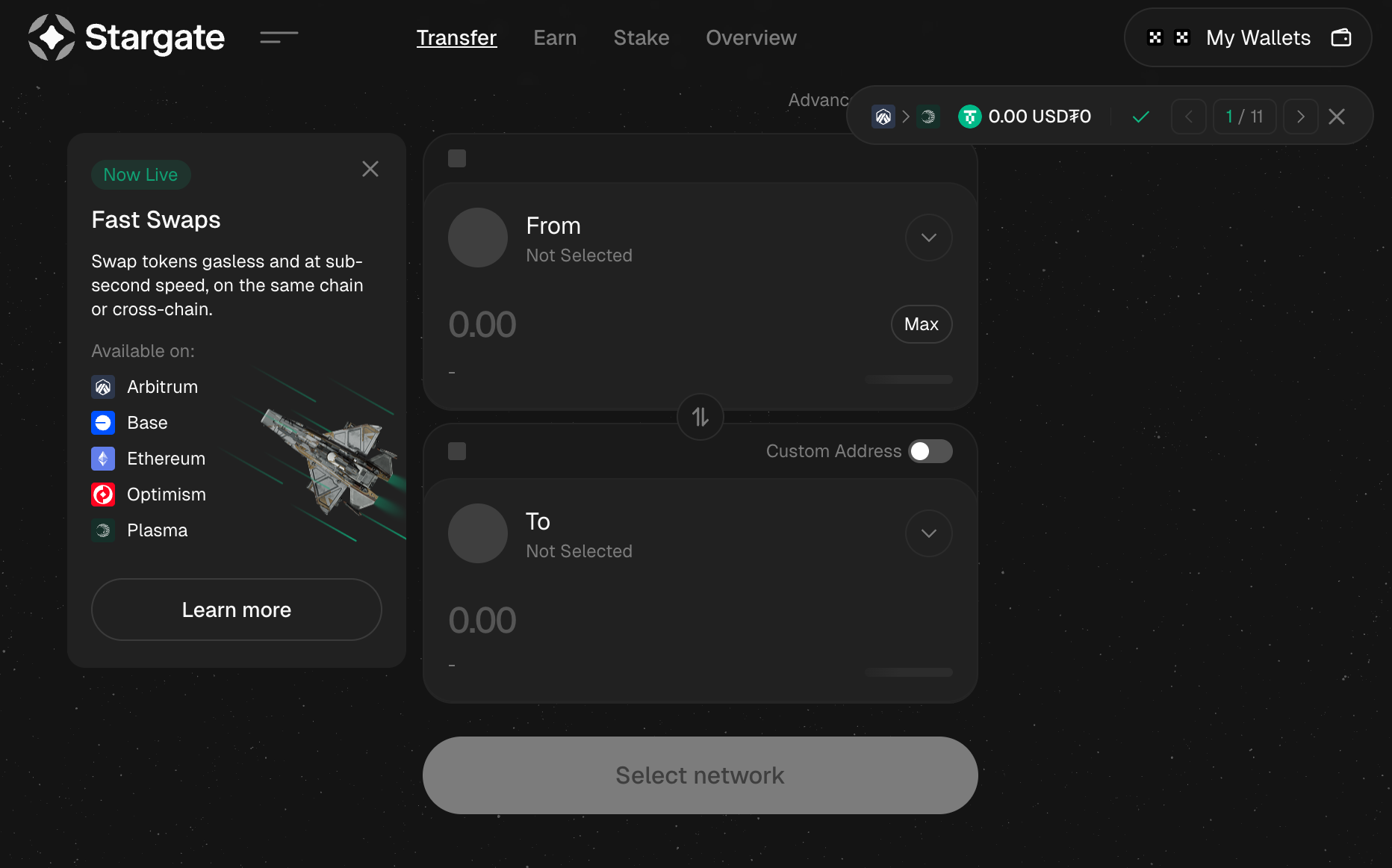 현재 자산을 보유한 체인과 토큰을 선택합니다. 예를 들어, 이더리움 네트워크상의 USDT를 선택할 수 있습니다. 다음으로 이를 전송할 대상 체인을 선택합니다. 예를 들어, 아발란체 체인을 선택할 수 있습니다.