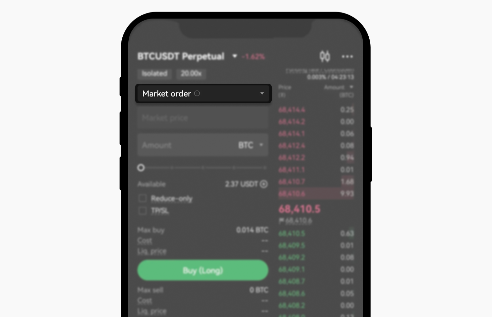 시장가 주문을 제출하려면 주문 창에서 'Market' 을 선택하고, 수량을 입력(예: 0.1 BTC)합니다. 다음으로 'Buy' 또는 'Sell' 버튼을 클릭하면 주문이 즉시 완료됩니다.