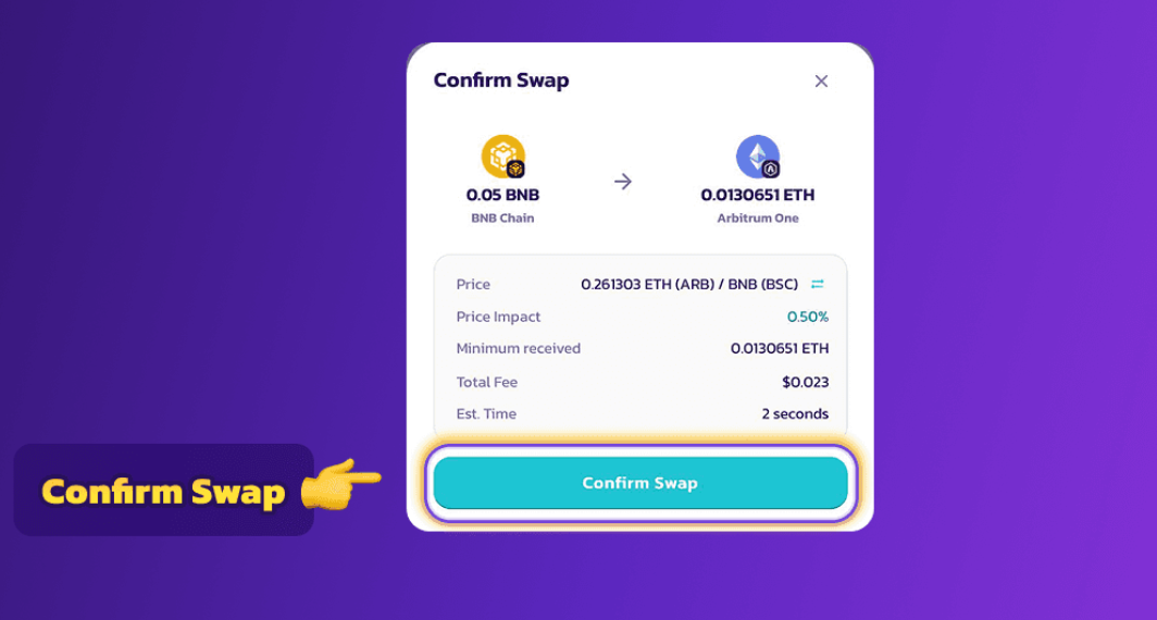 스왑을 클릭하면 확인 창이 표시됩니다. 'Confirm Swap'을 누르면 팬케이크스왑이 자동으로 어크로스 브리지를 통해 전송 경로를 설정하고, 릴레이어가 전송을 수행합니다.