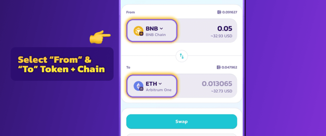 'From'에서 브리지 및 스왑을 시작할 체인을 선택합니다. 여기서는 BNB 스마트 체인의 $BNB를 예시로 들어보겠습니다.