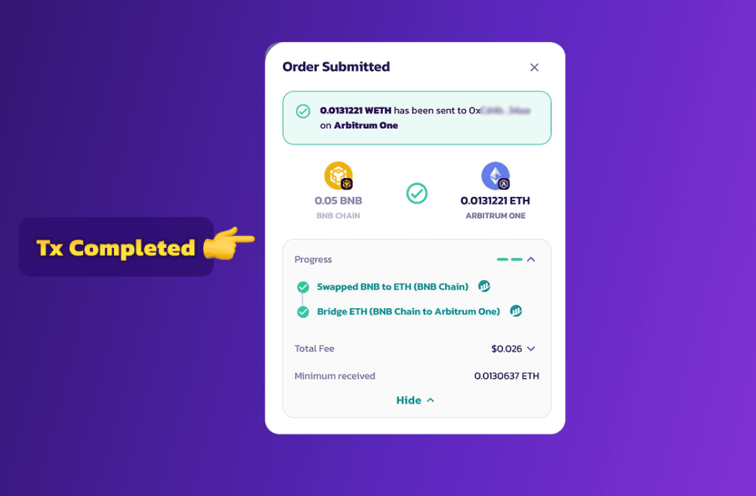 스왑이 완료되면 아래와 같이 트랜잭션 내역을 확인하실 수 있습니다. 브리지 및 스왑에는 다소 시간이 필요할 수 있습니다.