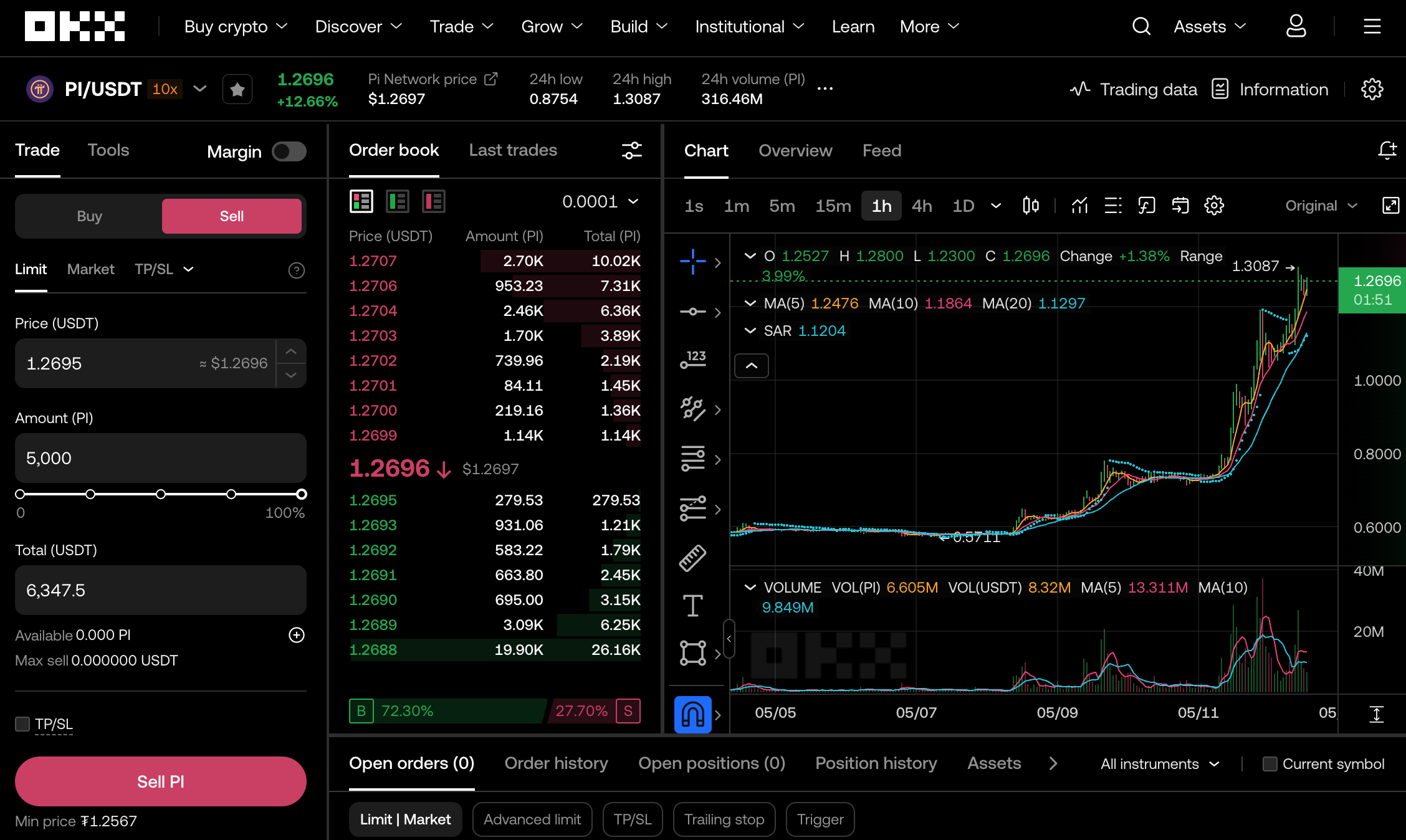 파이 코인 입금이 완료되면, 'Trade' - 'Spot'으로 이동하여 파이 코인을 판매할 수 있습니다. 티커를 검색하는 부분에 'PI'를 입력하고, 'PI/USDT'와 거래 페어를 선택해주세요.