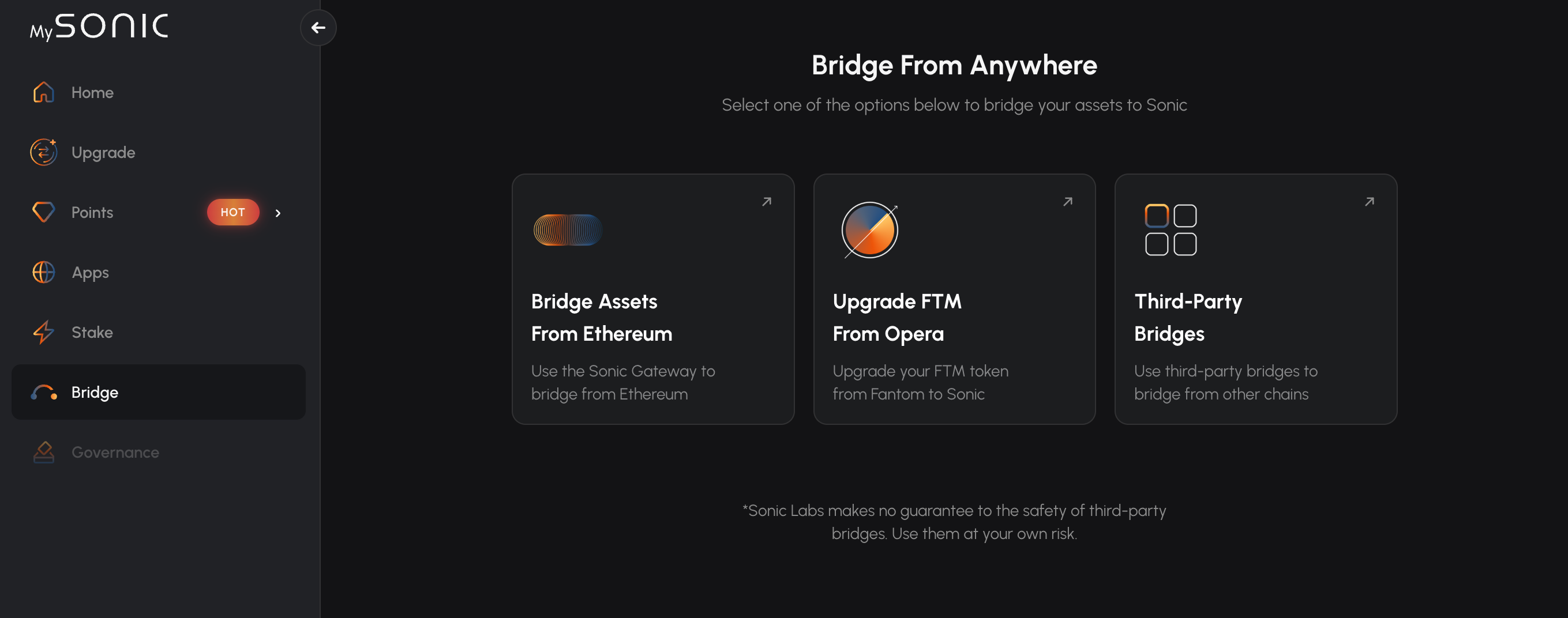 2025년 10월 기준, 소닉에서 외부로 나가는 공식 브리지는 없습니다. '들어올 땐 마음대로지만, 나갈땐 못나간다..'는 비즈니스 정신이 참 멋진데요. 그래서 서드파티 앱을 이용 해야 합니다.