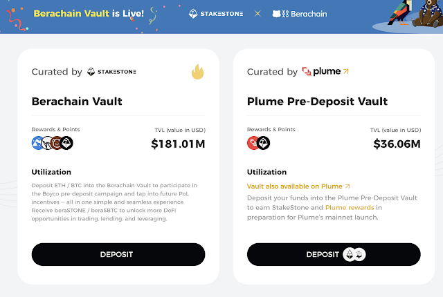 베라체인의 토큰 출시가 가까워짐에 따라, 스테이크스톤의 베라체인 볼트에 비트코인 및 이더리움을 예치하여 에어드랍 포인트를 파밍하려는 투자자들이 많아지고 있습니다.