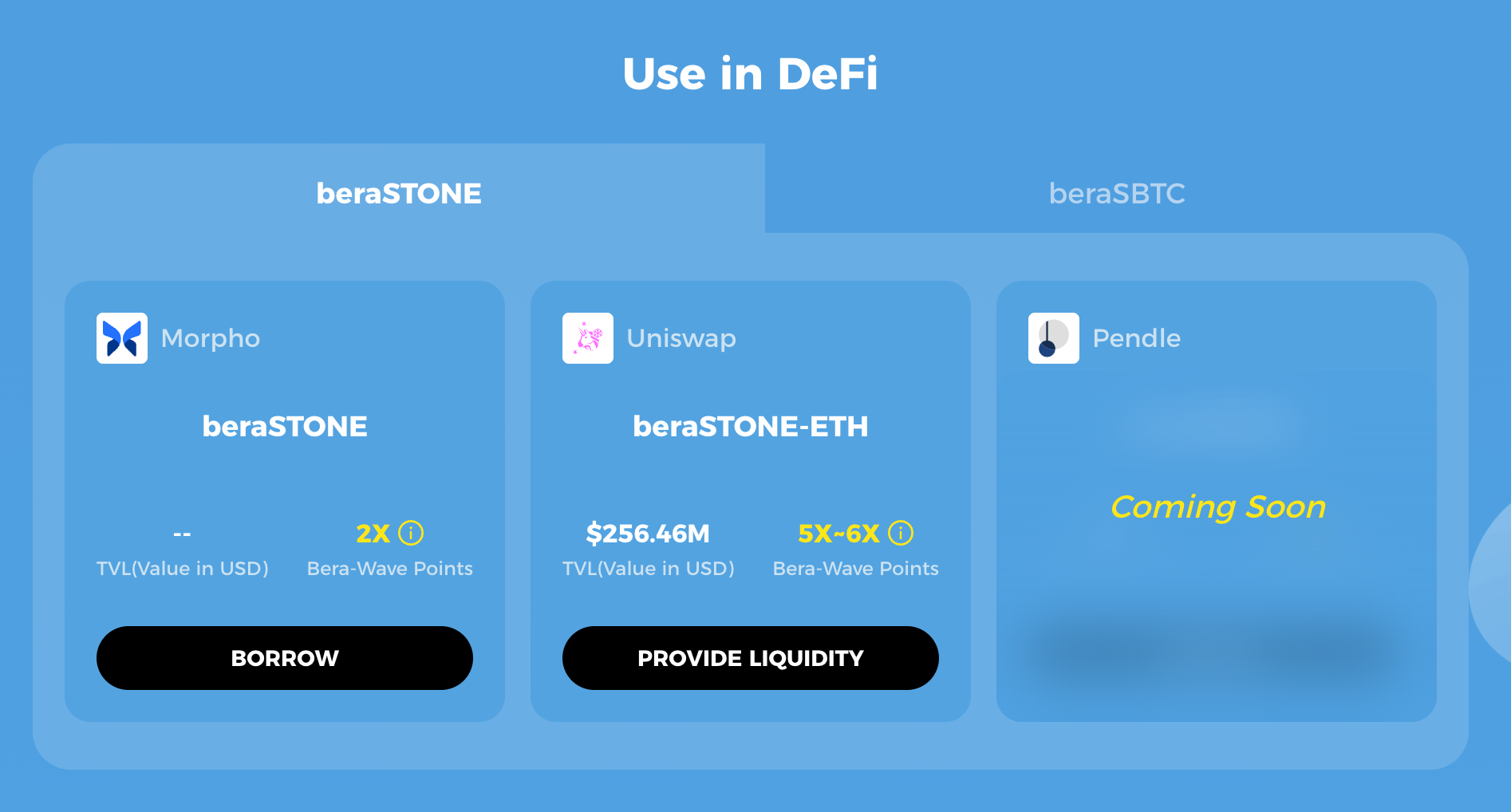 유니스왑에서 $beraSTONE/ETH 또는 $beraSBTC/WBTC 등의 유동성 풀에 자산을 공급하면 5~6배의 포인트 부스팅을 받을 수 있습니다.