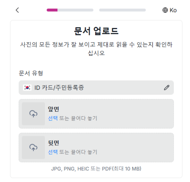 신분증 앞면과 뒷면을 촬영해서 업로드합니다. 이 때, 여권보다는 주민등록증이나 운전면허증을 사용하시는 것이 좋은데요. 이렇게 하시면 별도의 주소 인증을 거치지 않으셔도 됩니다.