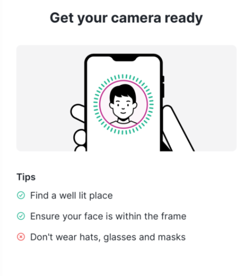 셀카를 한 장 찍어야 합니다. 카메라가 켜지면 프레임 안에 얼굴을 위치시키고, 얼굴 인증을 완료하세요. 신분증과 얼굴을 대조하는 과정을 거치게 되며 약 1분에서 2분 정도 시간이 소요될 수 있습니다.