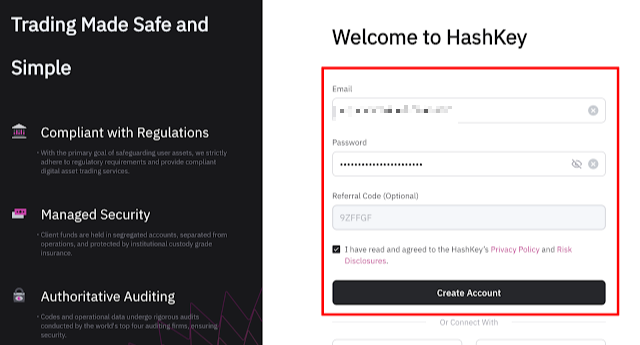 해시키 거래소에서 사용할 이메일 주소와 비밀번호를 설정해야 합니다. 이용 약관 옆에 있는 체크박스에 동의하시고, 'Create Account'를 눌러주세요.