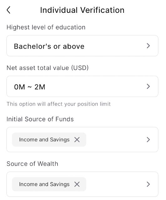 또한, 해시키 거래소에서는 직업과 소득 수준, 자산 정보 등도 묻는데요. 다행히도 직접 검증하는 것은 아니기 때문에 무난하게 아래와 같이 선택해주시면 큰 문제가 없습니다.