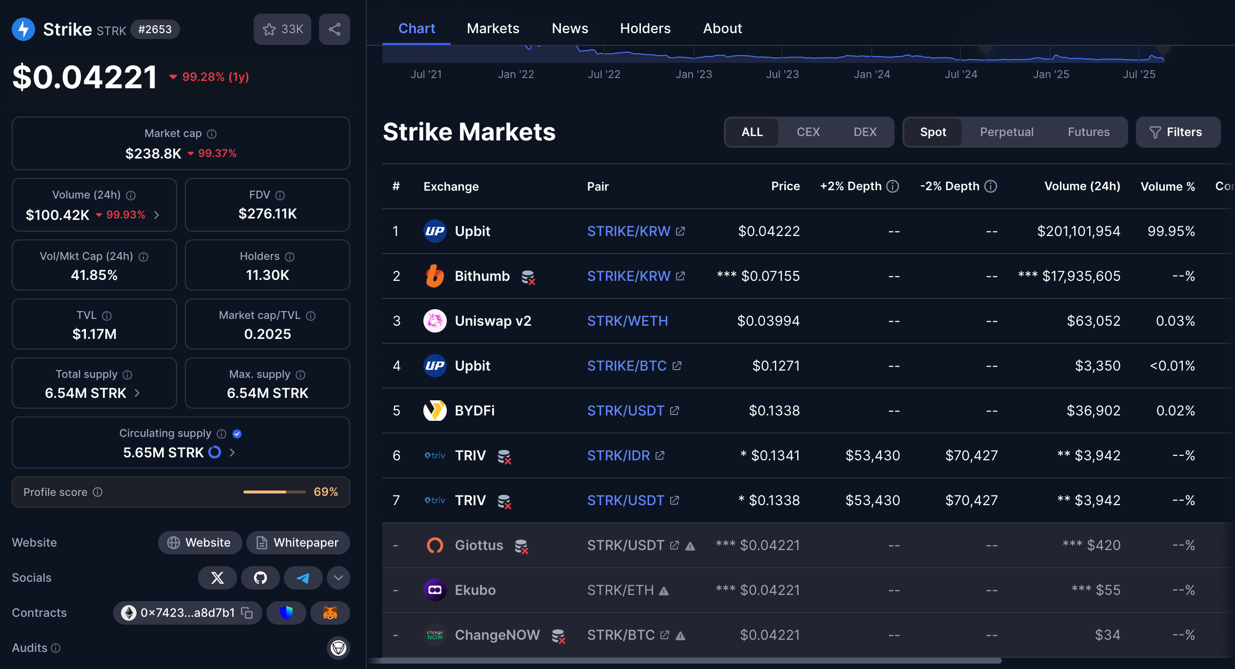 예를 들어, 2025년 8월에 상장 폐지된 스트라이크 같은 경우에는 아래와 같이 국내 거래소 업비트 및 빗썸을 제외하고는 지원하는 거래소가 없는데요. 이 경우에는 개인지갑으로 코인을 출금해서 매도할 수 밖에 없습니다.