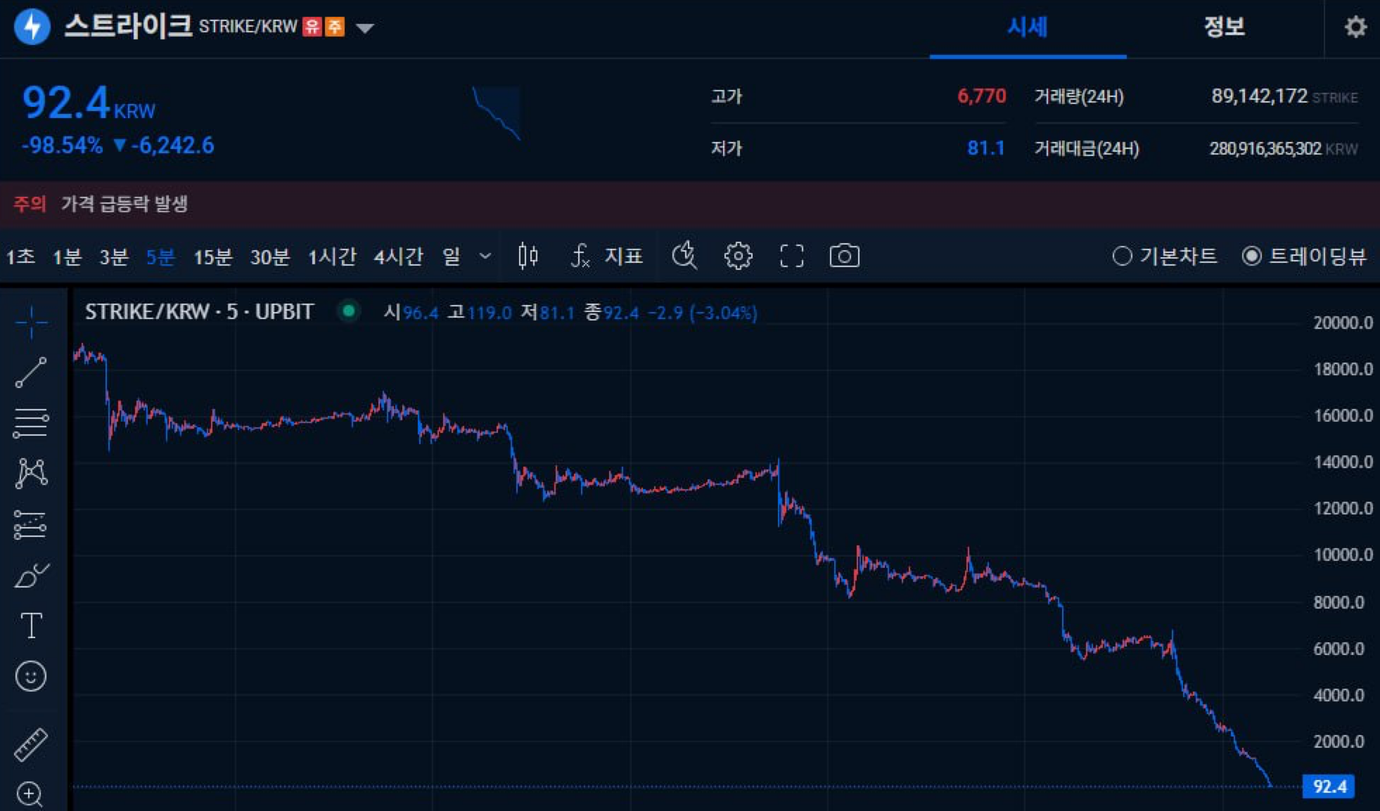 실제 예시를 살펴보도록 하겠습니다. 업비트에서 상장폐지된 스트라이크 코인과 같은 경우에는 거래를 지원하는 해외 거래소가 전혀 없습니다. 따라서, 개인지갑으로 출금 후 매도하는 것이 유일한 방법인데요.