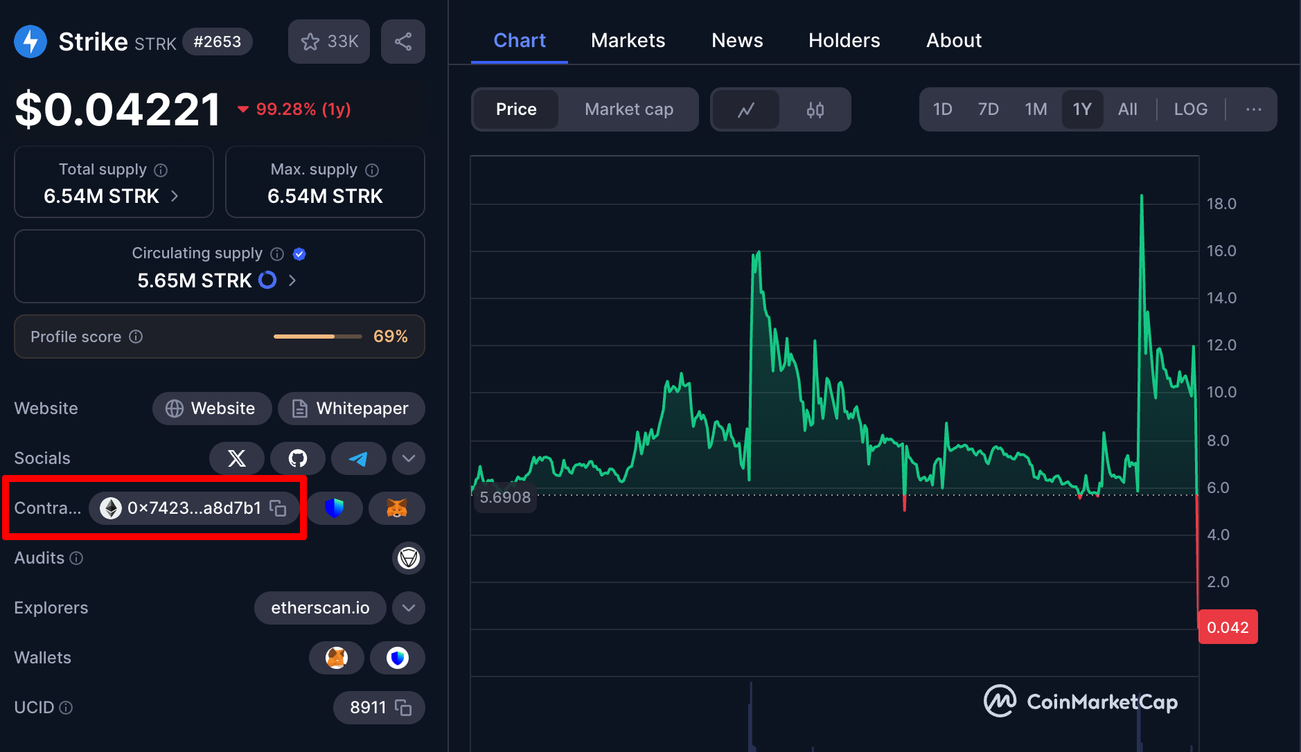 업비트에 메타마스크 또는 OKX 지갑과 같은 개인 지갑 주소를 등록 후 출금을 완료해주세요. 다음으로 유니스왑 및 1인치 거래소에 접속하여 스트라이크 컨트랙트 주소 0x74232704659ef37c08995e386a2e26cc27a8d7b1를 정확하게 붙여넣어 줍니다.
