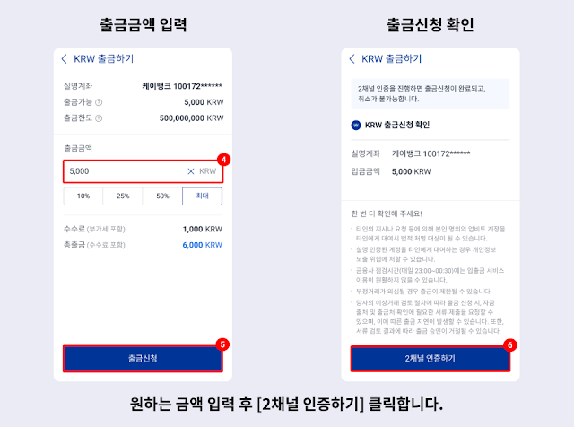 이후 본인의 은행 계좌를 선택하고 출금할 금액을 입력해주세요. 출금은 본인 명의의 계좌로만 가능하며, 1회 출금 한도는 1억 원, 하루 최대 5억 원까지 출금할 수 있습니다.
